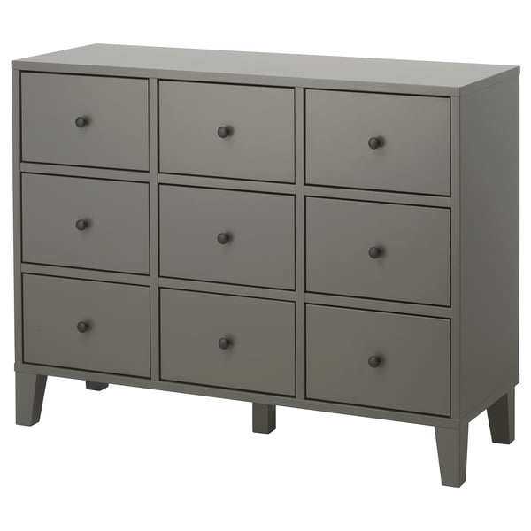 Pequeña cómoda restaurada y pintada en gris con esencia antigua Comoda de madera Vintage gris. 5 cajones | Muebles blanco y madera BRYGGJA Cómoda de 9 cajones, gris oscuro, 118x92 cm IKEA