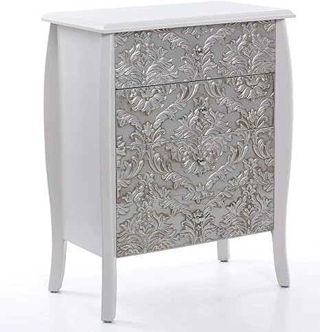 DRW Cómoda sinfonier lacada Blanca y Plateada, Madera, 70 x 40 x Cómodas de madera con tres cajones y acabado plateado de diseño Cómoda plateada SILVER de 4 cajones con tiradores de cristal